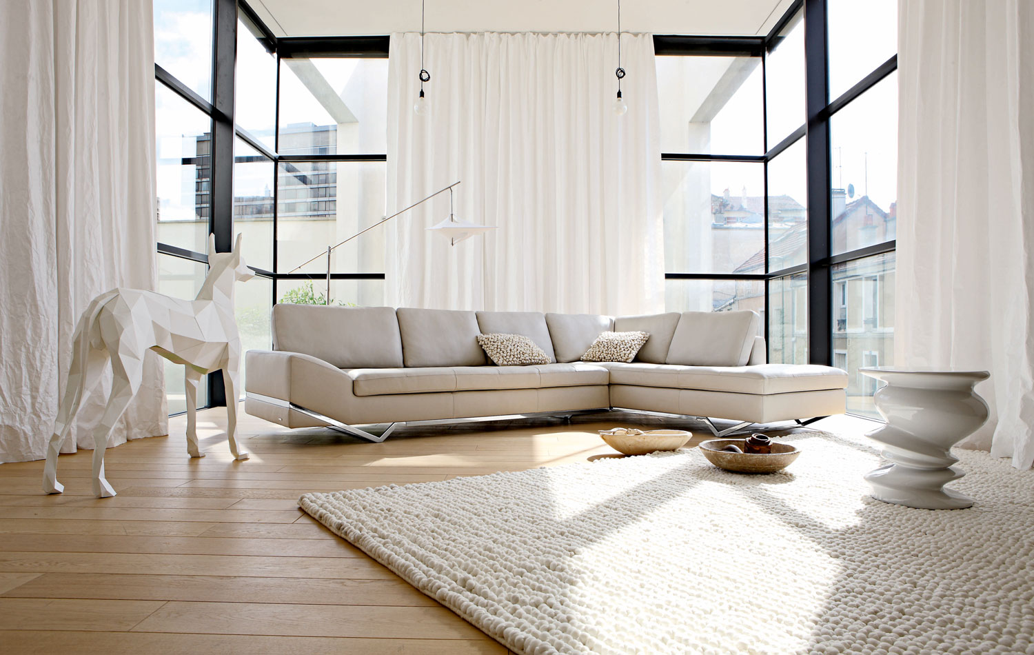 Không cần tone màu nóng nhưng bộ sofa vẫn nổi bật khi được bố trí cùng với sàn nhà, rèm cửa, trần nhà sáng màu và hệ thống cửa kính lớn tận dụng tối đa ánh sáng tự nhiên. Đặc biệt, không gian còn ấn tượng hơn với hệ thống đèn chiếu bao phủ khắp trần nhà.